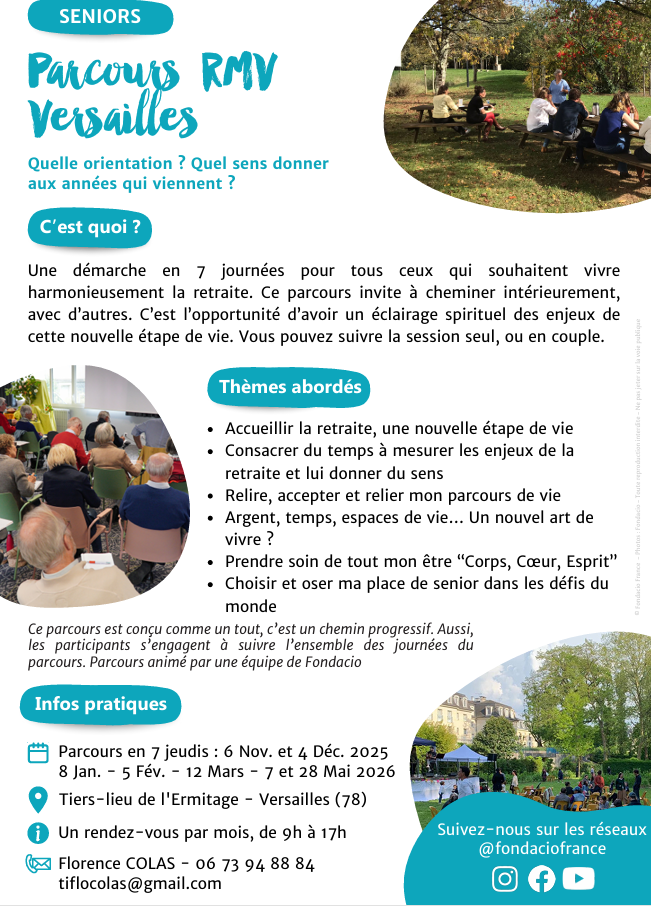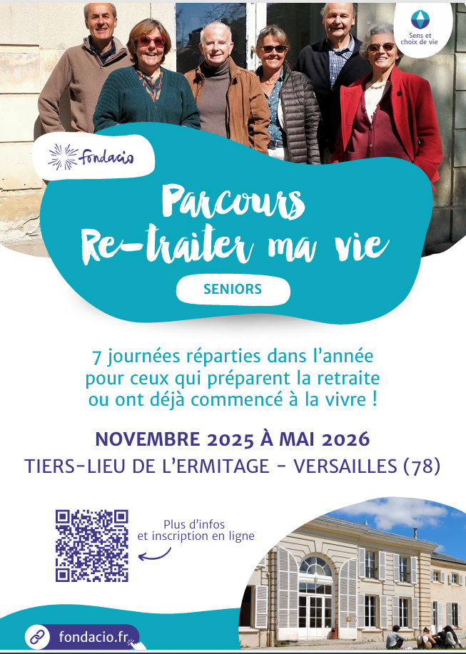 FONDACIO, mouvement chrétien à l’Ermitage à Versailles, vous propose un parcours en 7 journées (un jeudi par mois à partir du 6 novembre) ouvert à tous les jeunes retraités et aux personnes proches de la retraite.